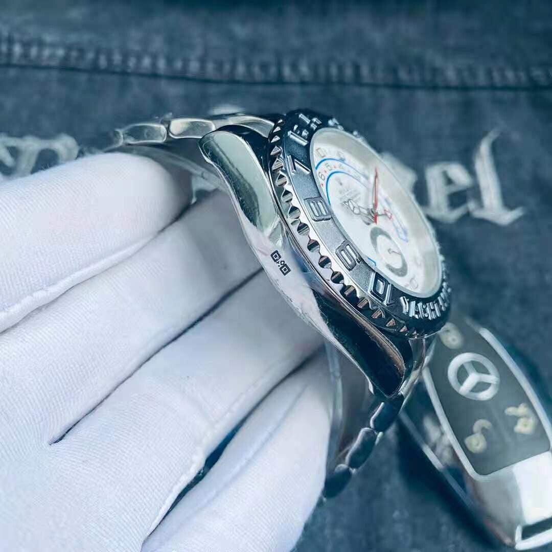 The Rolex Yacht-Master II This is a specialized steel regatta chronograph built for yacht racing, featuring a vibrant sky-blue Cerachrom "Ring Command" bezel used to program its countdown timer, a bright white "Oyster" dial for maximum legibility, and distinctive blue hands. Its most notable function is a programmable 10-minute mechanical countdown with a mechanical memory, powered by the in-house Calibre 4161, all housed in a robust Oystersteel case with the iconic Oyster bracelet, making it a unique and purpose-built tool watch for competitive sailors.