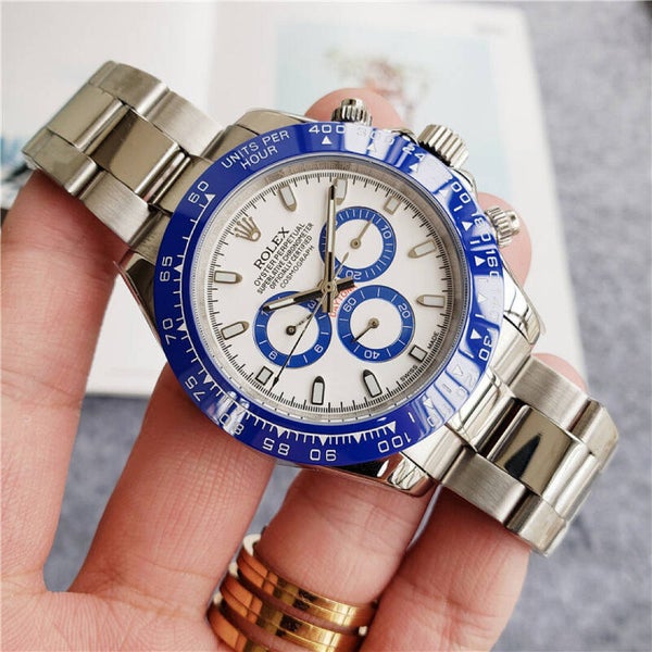 A replica Rolex Daytona with a blue dial is a non-genuine timepiece made to imitate the look of the real Rolex Daytona — with a striking blue face and chronograph subdials, often built in stainless steel or two-tone metal with automatic movement and tachymeter markings.